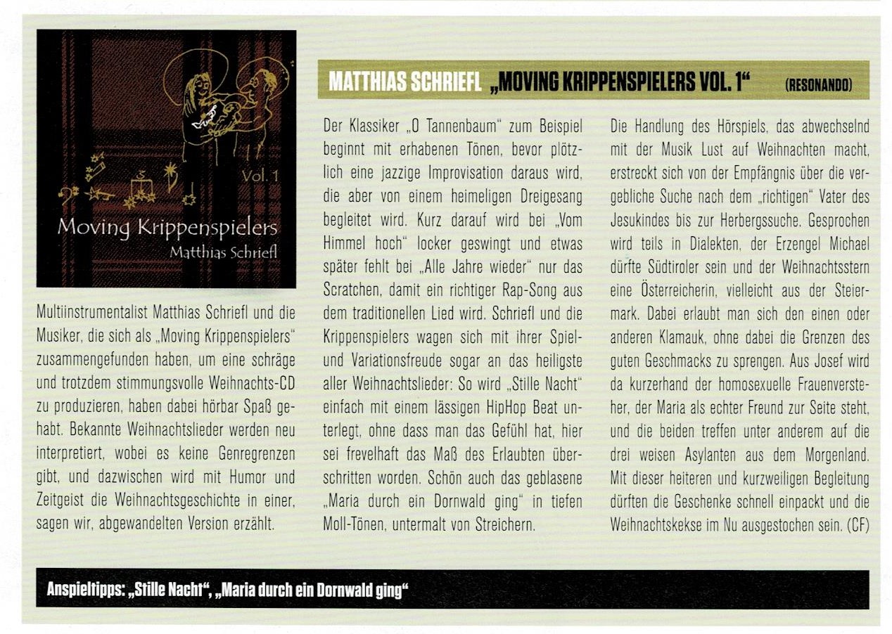 "Matthias Schriefl kenne ich nun schon seit vielen Jahren und verfolge sehr aufmerksam seinen musikalischen Werdegang, meist abseits des Mainstreams, immer auf der Suche nach neuen Einflüssen, die oft angestammte Hörgewohnheiten reizen können. Mit seiner neuesten CD, dem Projekt „Moving Krippenspielers“, hat Matthias Schriefl nun sich selbst übertroffen. Von seinem Label wird diese CD mit dem Worten „Ein Krippenspiel der etwas anderen Art: mit viel Schalk und anarchischer Lust“ angekündigt. Diese Beschreibung ist kein hochtrabender Werbetext, sondern trifft den Kern dieser Produktion haarscharf und punktgenau. Es ist in der Tat ein anarchisches Gesamtkunstwerk, dessen Ulk oder Schalk auch einem Helge Schneider sehr gut stehen würde. Doch abgesehen von den Textbeiträgen bieten vor allem die musikalischen Teile ein besonderes Vergnügen. Traditionelle Lieder, die zur Weihnachtszeit zum allgemeinen Musikkanon zählen, kommen plötzlich in einem ungewohnt fremden Gewand daher, jazzig, vor allem sehr oft stramm groovend und zum Mitwippen animierend. Beachtlich ist vor allem die große Palette der Stilrichtungen, mit denen das bekannte Weihnachtsliedgut neu gestaltet worden ist. Für mich ein besonderer Hörgenuss." Gerhard Richter