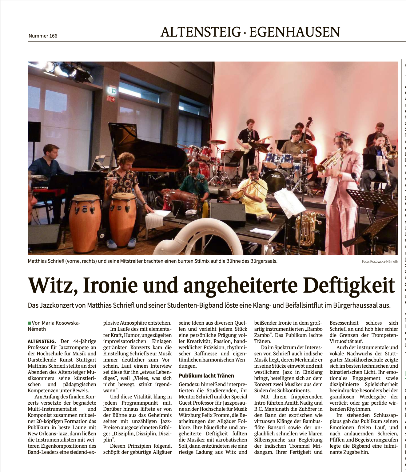Nach einem intensiven Semester an der HMDK, an dem ich die Big Band des Jazzinstituts leiten durfte und einen Workshop mit BC Manjunath und Amith Nadig für alle Studis organisierte, freue ich mich über den sehr inspirierenden Abschluss mit diesem Auswärts-Konzert, das auch vom der Schwarzwälder Botenbegeistert beschrieben wurde.