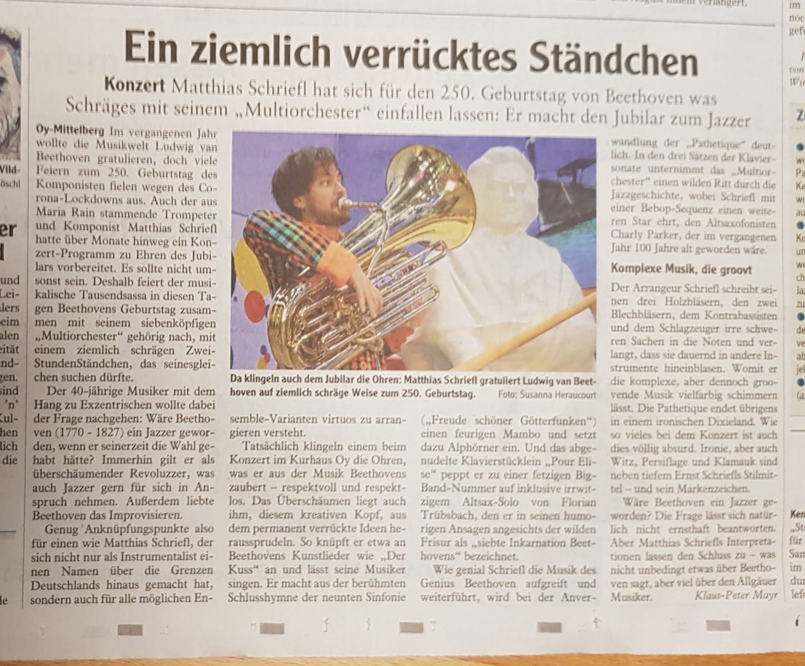 Eine sehr positive Kritik über das Jazz, Jam & Beethoven - Programm mit dem MULTIORCHESTER in der Allgäuer Zeitung vom 8.Juli 2021