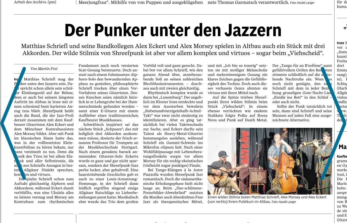 Artikel aus der Allgäuer Zeitung vom 18. Juni über ein Konzert im Altbau Irsee mit Shreefpunk Trio unplugged